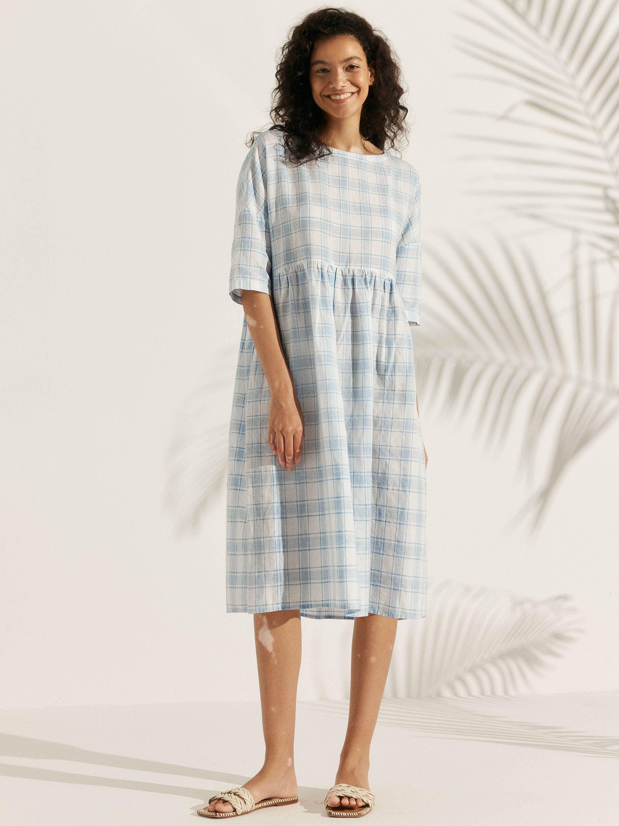 Linen Gingham Checked Cap Sleeve Washed Maxi Dress