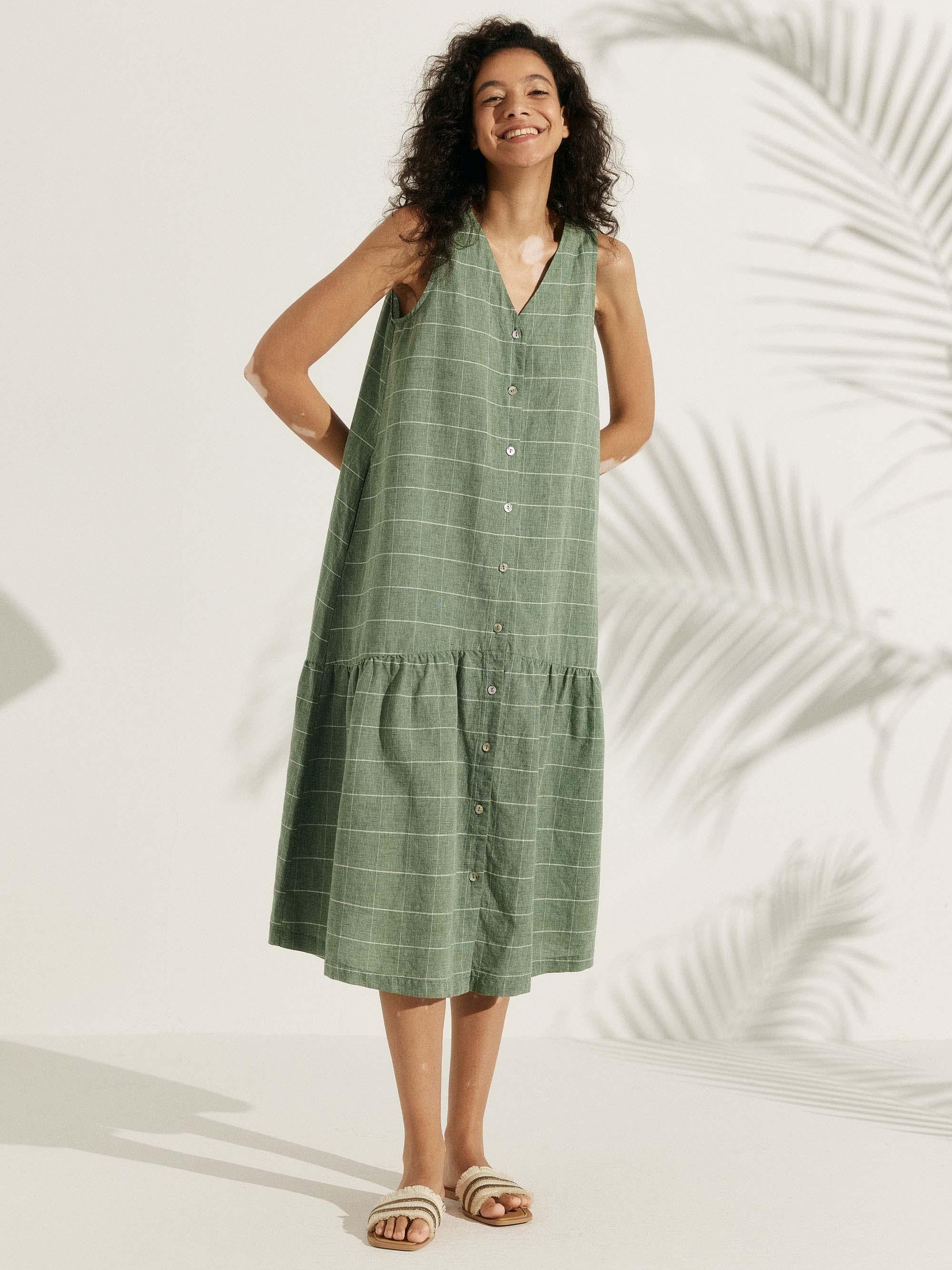 Linen Vacation Gingham Sleeveless V-Neck Mid-Length Dress