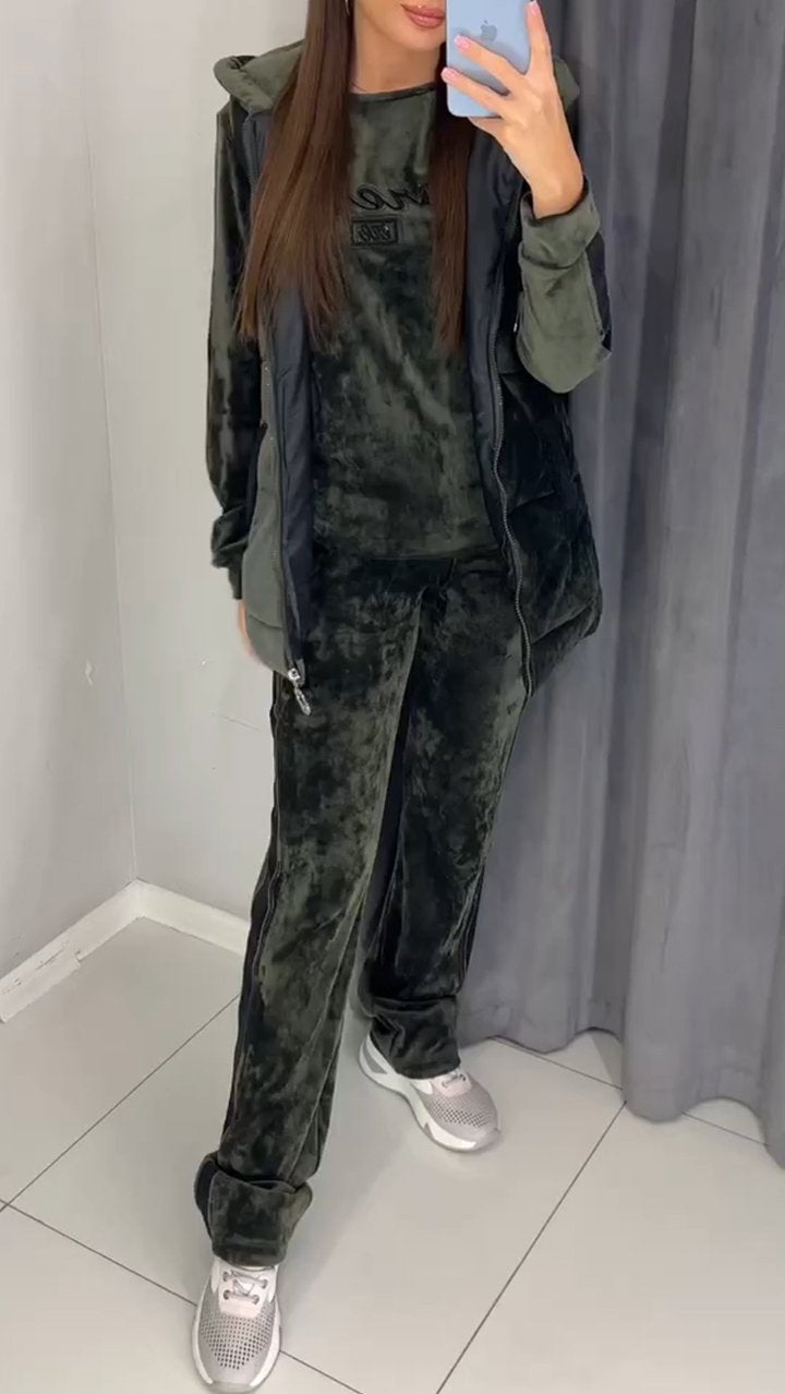 Women's Casual Long Sleeve Autumn and Winter Hooded Velvet 3-piece Suit