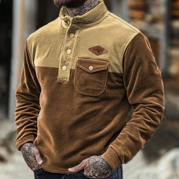 Men's Vintage Yellowstone Corduroy Contrast Button Henley Stand Collar Pocket Outdoor Sweatshirt