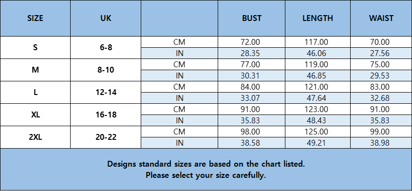 Size Guide: Small/US 4-6, Medium/US 8-10, Large/US 12-14, X-Large/US 16-18. XX-large/US 18-20Suggest to iron in low before wearing!!