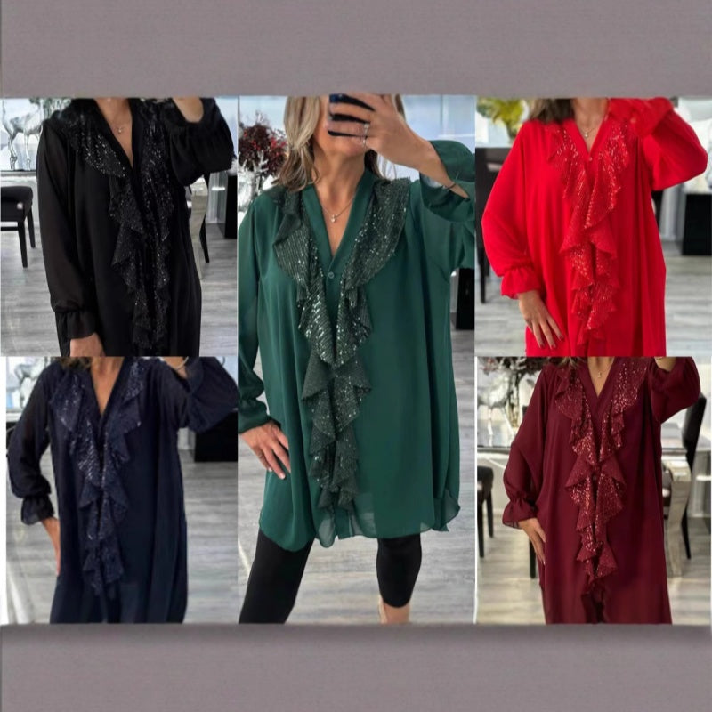 Package Included: 1*Women's V-Neck Chiffon Sequin Long Sleeve Shirt