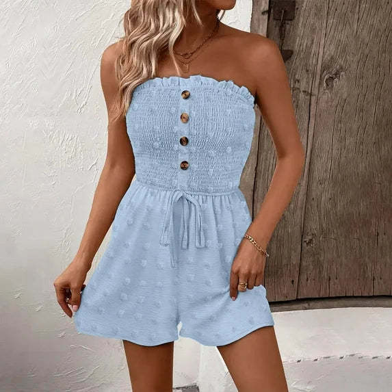 💝Elevate Your Style with Our Women's Fake Buttons Frill Trim Shirred Tie Front Wide Leg Tube Romper💞