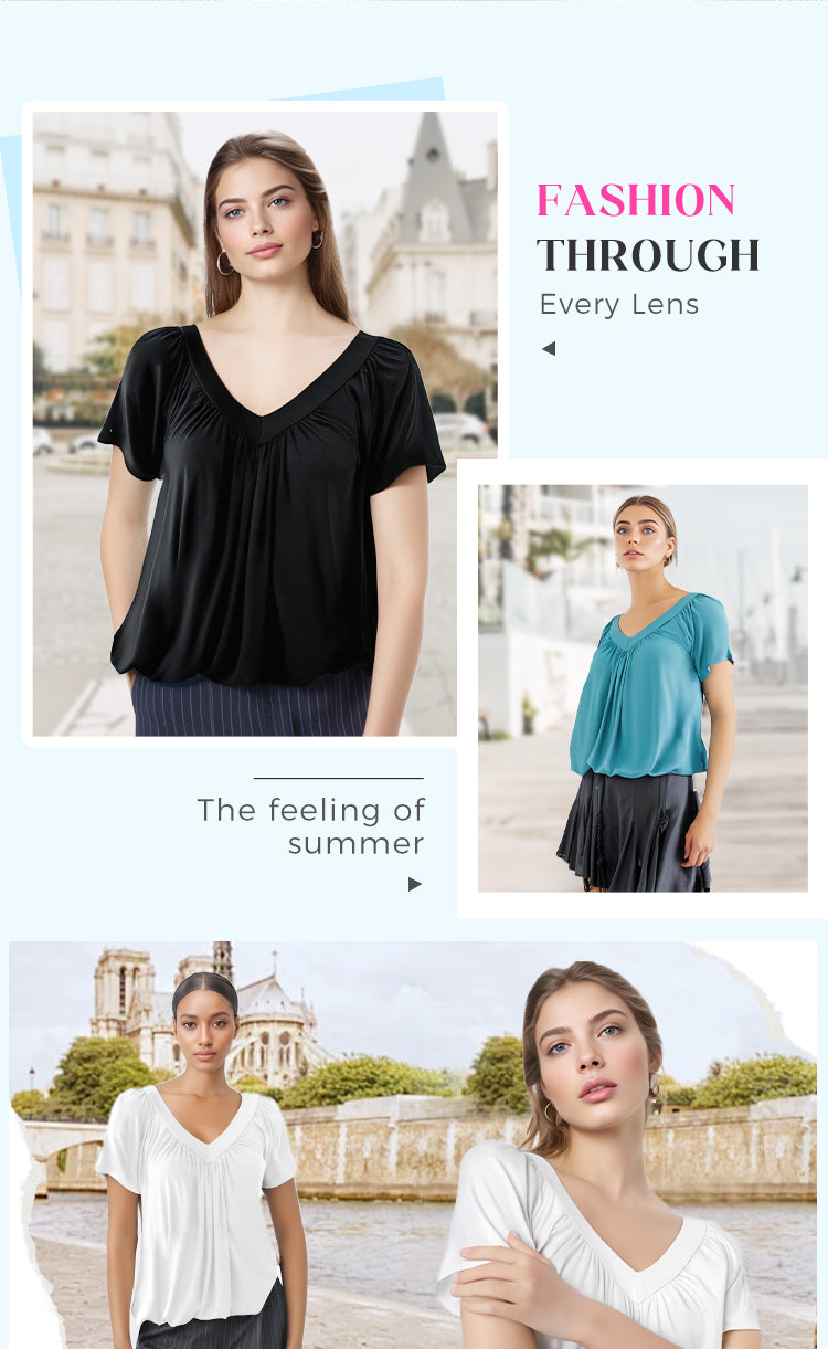 Women's Casual Pleated V-Neck Short-Sleeve Top